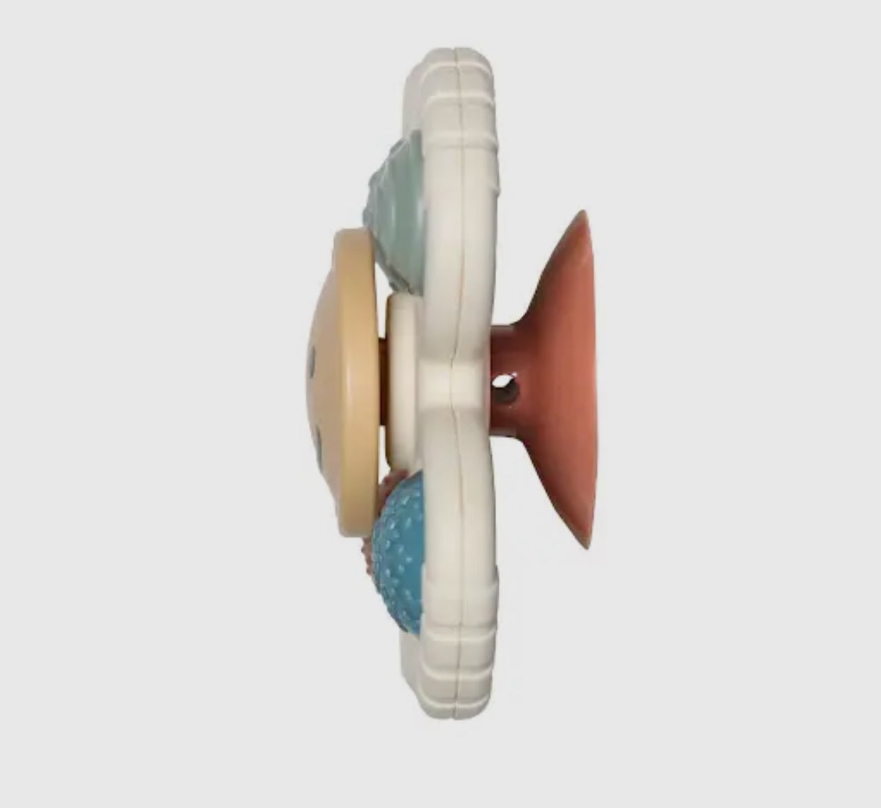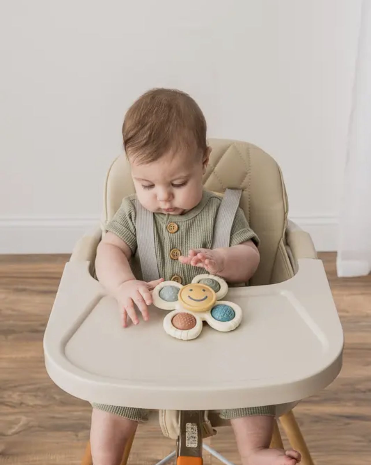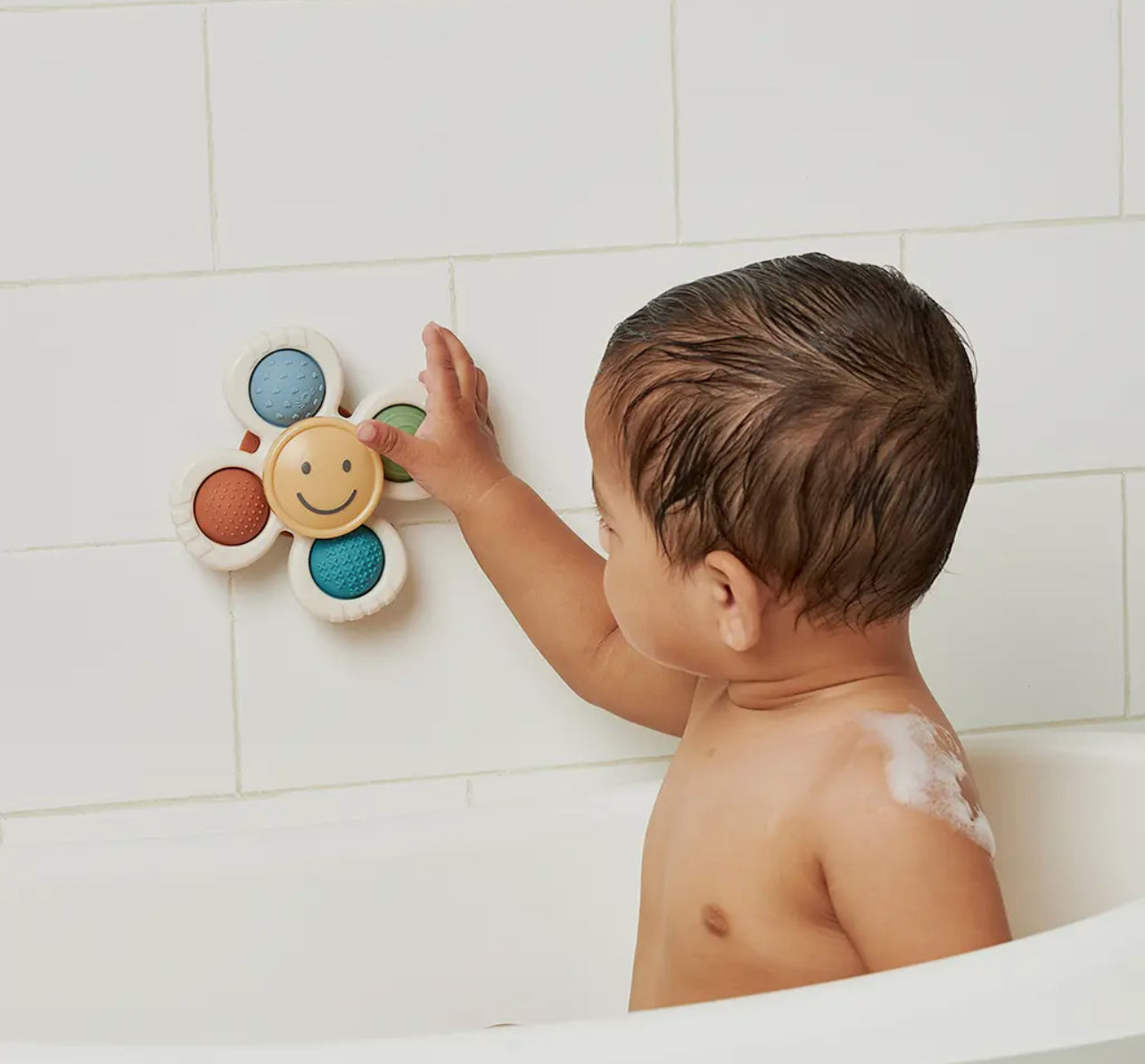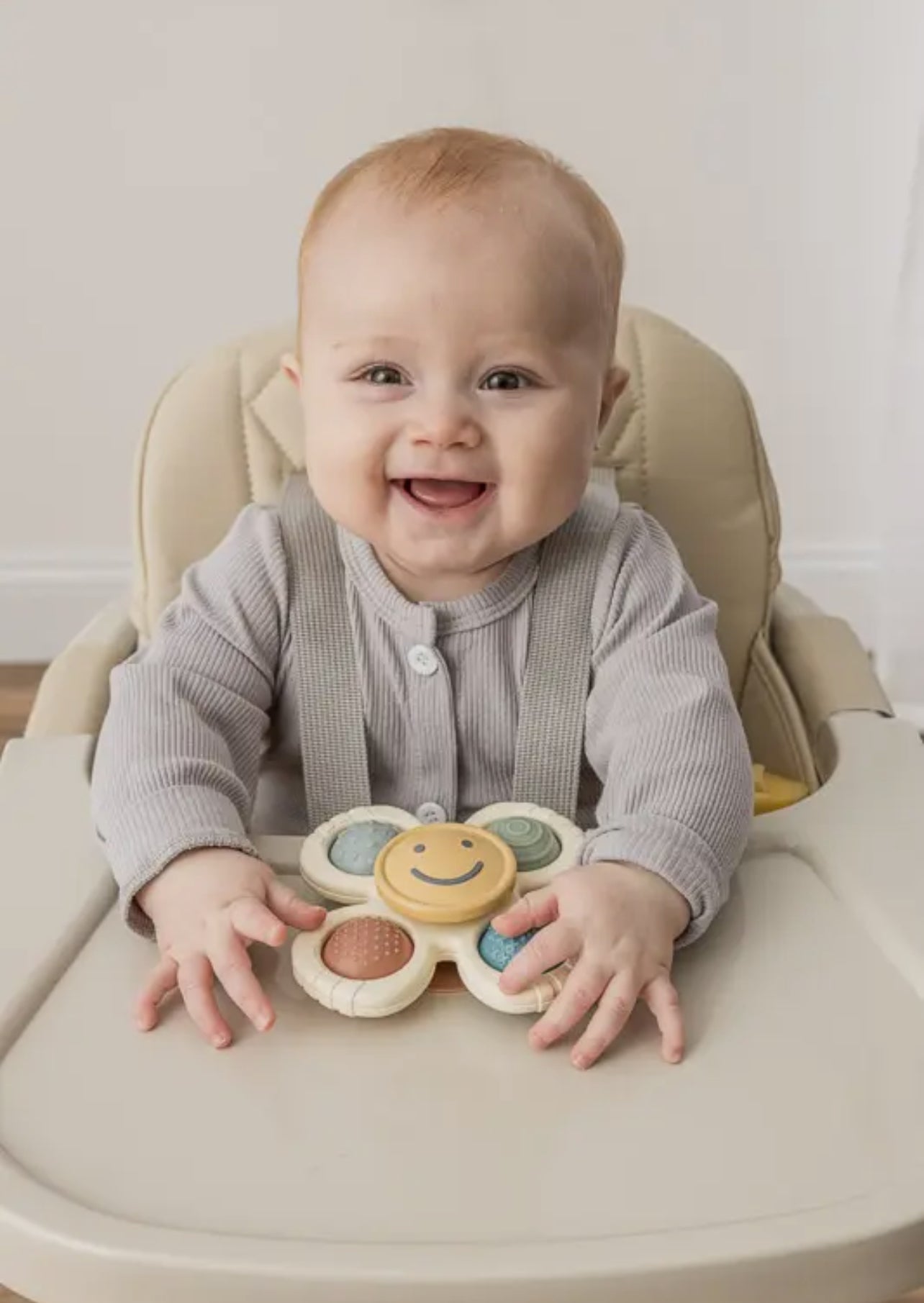 Put a new spin on sensory play with the Itzy Pop & Whirl fidget toy. Featuring a suction cup base, it sticks to tables, tubs and other smooth surfaces for sensory play at home and on the go. Four textured silicone poppers engage baby and help build fine motor skills.
