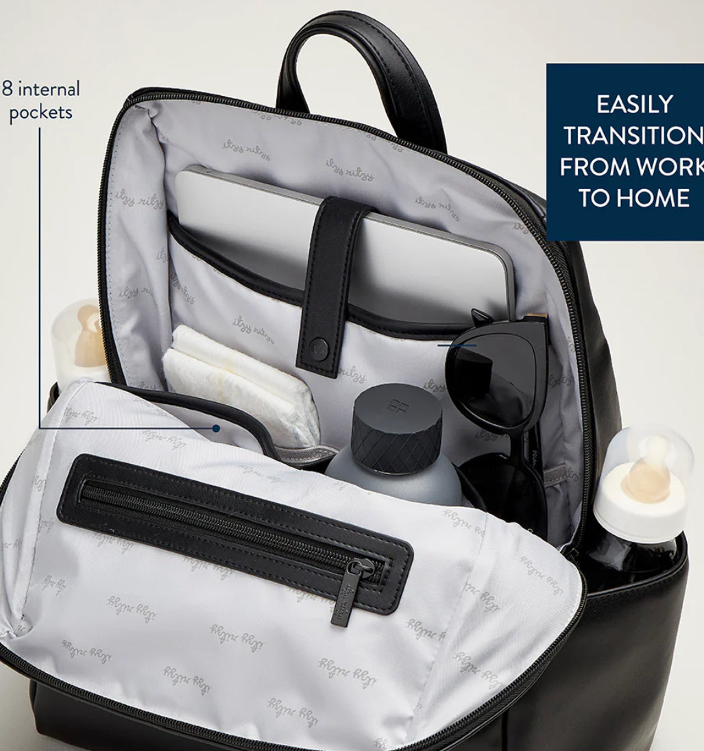 Introducing the Eras Diaper Bag Backpack! This is your ultimate companion for all stages of parenthood & beyond. Crafted with gorgeous vegan leather and a sleek design, this bag lets you keep owning your unique personal style - we just add in the functionality every parent needs. With 15 total pockets, you’ll feel totally organized and confident through every era of parenthood. Newborn era? There’s plenty of room to organize everything for your inaugural Hot Mom Walk. Toddler era? A hands-free style lets you run around with your little with ease. Heading to the office? Your laptop has its own, personal pocket. Traveling with the fam? The trolley sleeve in the back makes this your airport bestie.