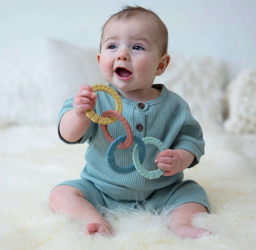 Love these Links! A rainbow of color & endless entertainment awaits with our Ritzy Rings™ from our Bitzy Bespoke™ collection! Ultra-versatile with various ways to play, watch as baby’s hands stay busy shaking and tugging the rings. Easily keep toys nearby by attaching them to play areas, car seats, and strollers. The braided ring features a subtle texture designed to soothe baby’s sore gums.