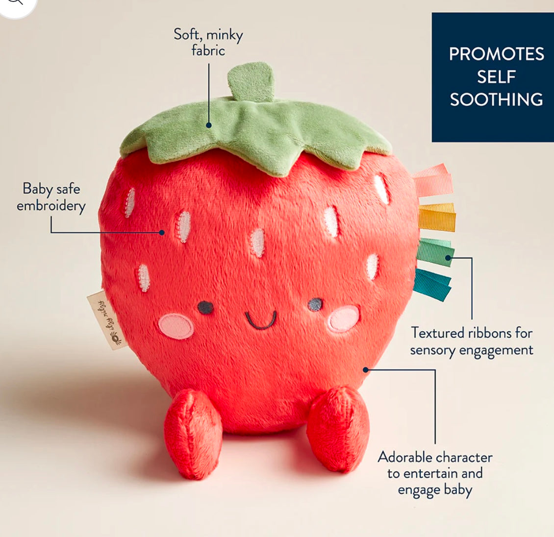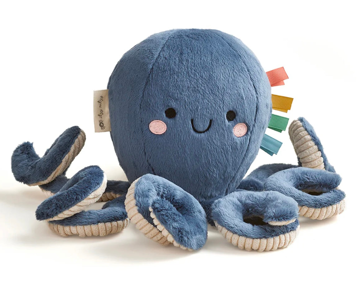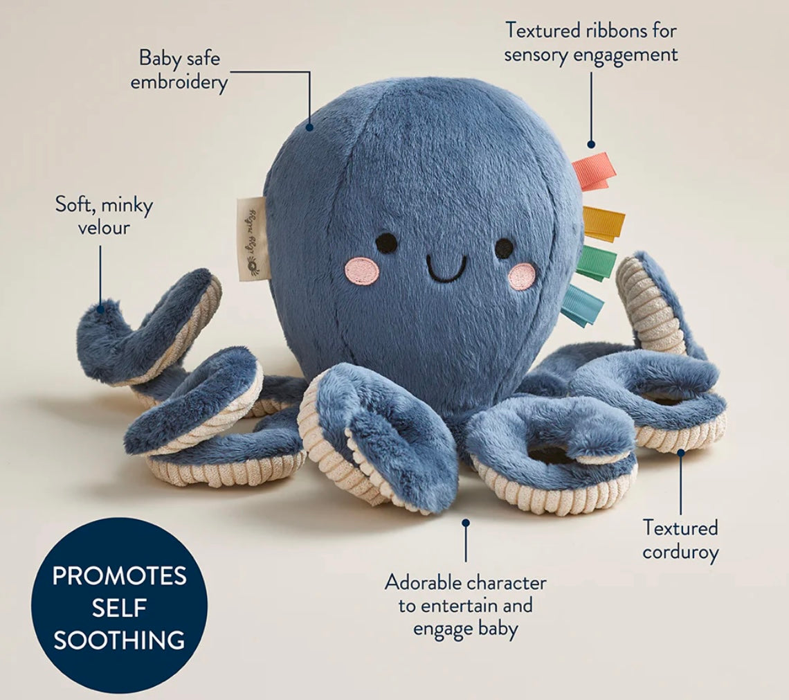 Our iconic characters, Ollie the Octopus & Bonnie the Strawberry, brought to life in a soft, cuddly plush. Features multiple soft fabric textures and ribbons for sensory exploration and promotes self-soothing.