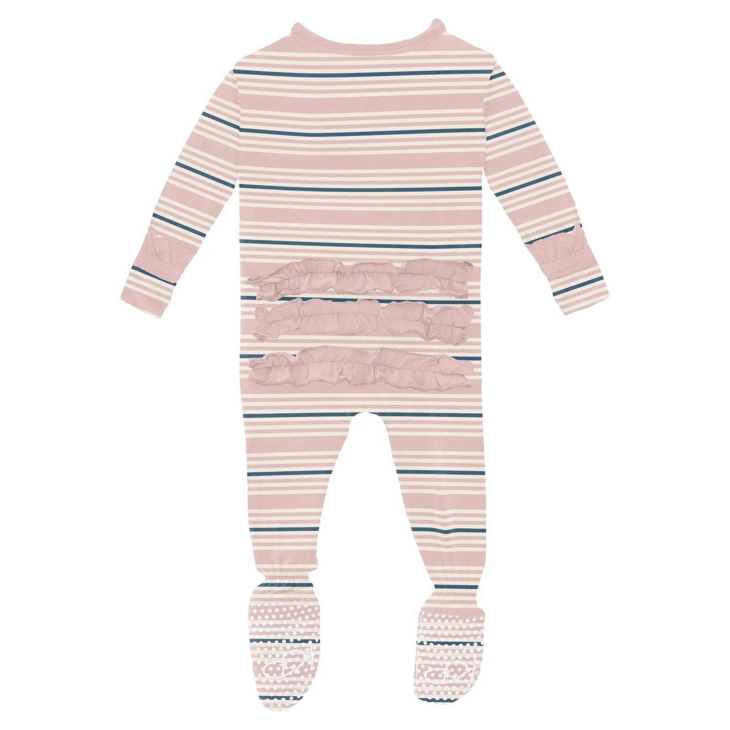 We took cuteness up a notch! Our traditional footie, with flip paws to cover chilly hands and prevent scratching, fleece on the inside feet, and no-slip grips on the outside feet, now has sweet ruffles along the front zipper and rear snaps. Perfect for your little princess!