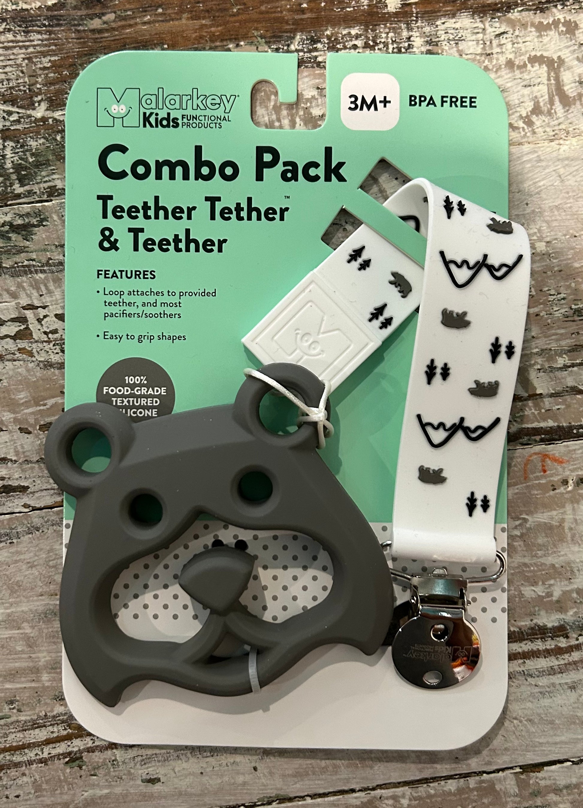 The Teether Tether and Teether is a multi-purpose teething toy. The teether comes in a number of fun shapes designed for easy gripping while the tether's patterns are textured to soothe baby and provide visual stimulation. Both teether and tether are made from soft, flexible, food-grade silicone with textures that gently massage baby's gums. The convenient clip attaches to all fabrics while the interchangeable loop attaches to most pacifiers and teethers keeping them close and clean.