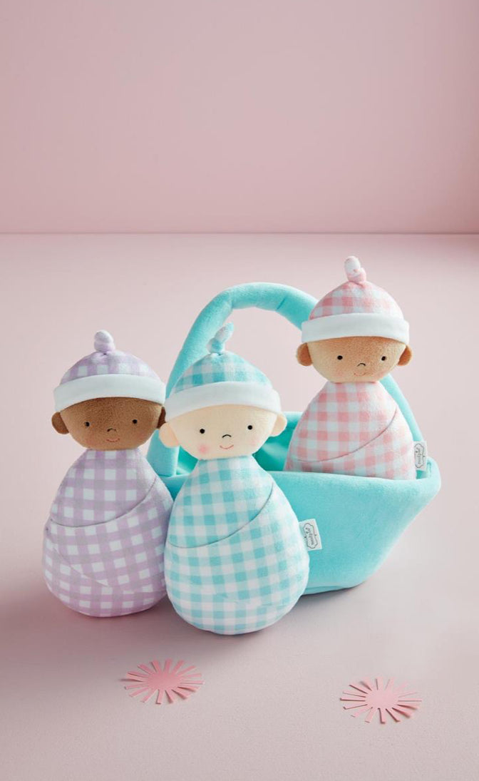 Description: 4-piece set. Minky basket holds three minky plush babies that giggle, laugh and cry when pressed. Ages 18M+.