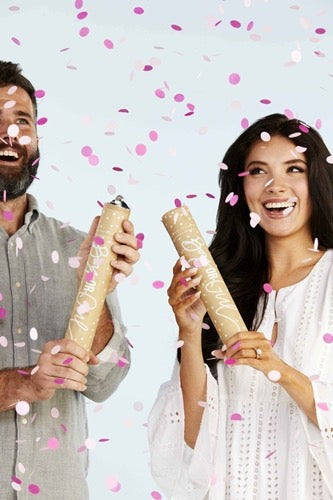 Kraft tube popper with biodegradable paper confetti. Removable pink or blue sticker indicates gender.