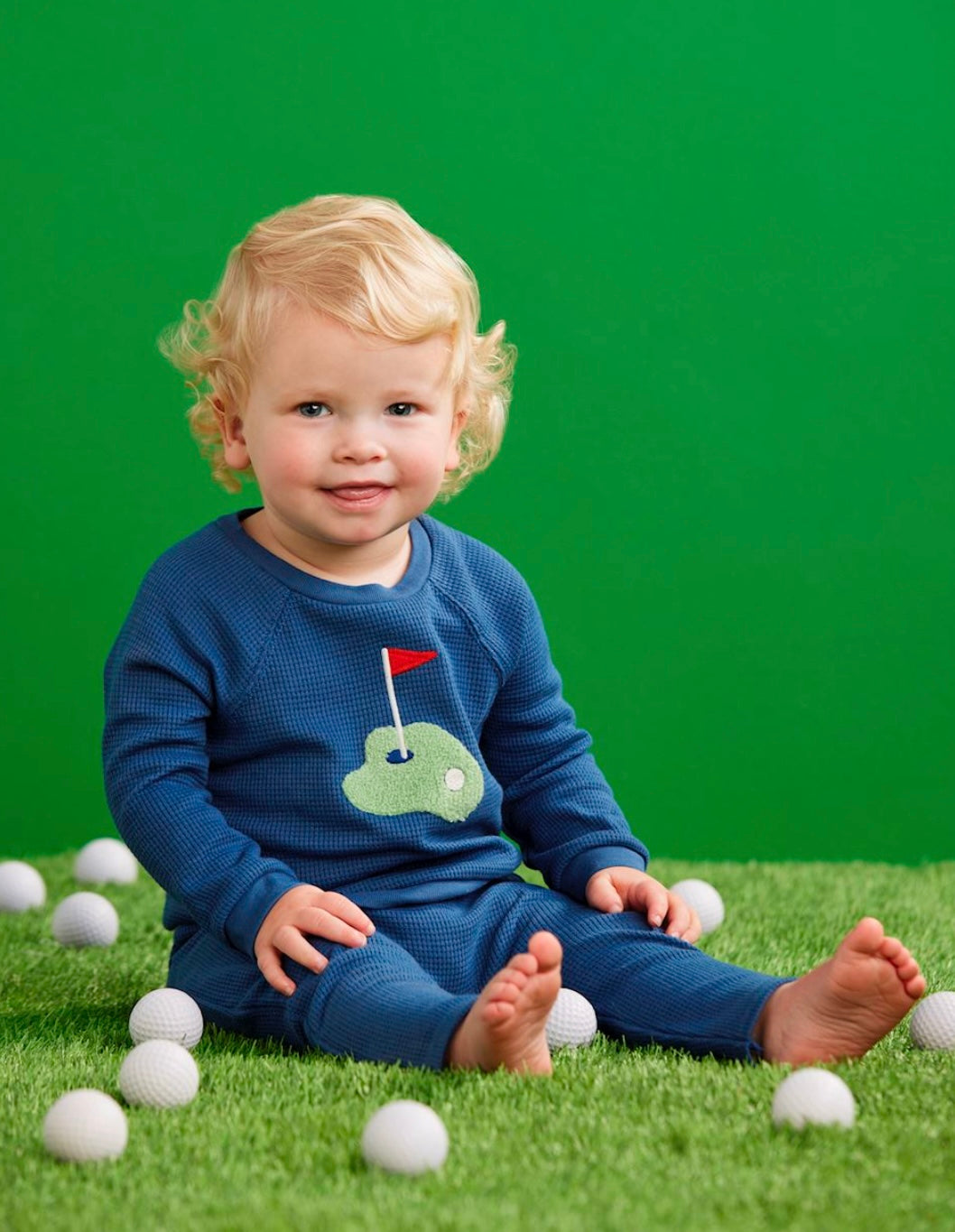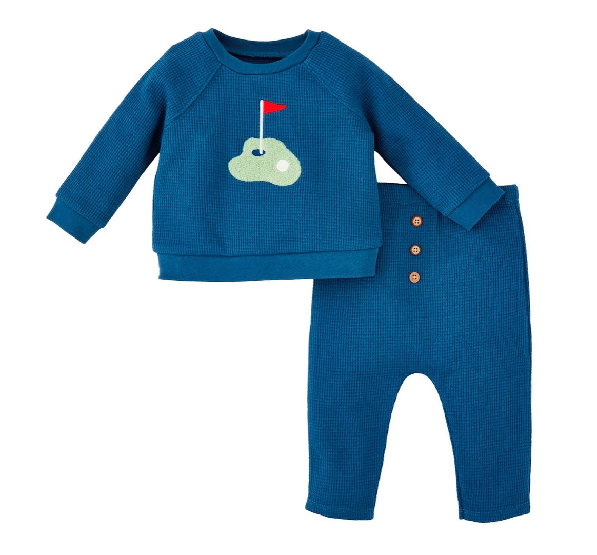 2-piece set. Appliqued waffle weave cotton long sleeve top. Comes with pull-on pants with decorative coconut wood buttons