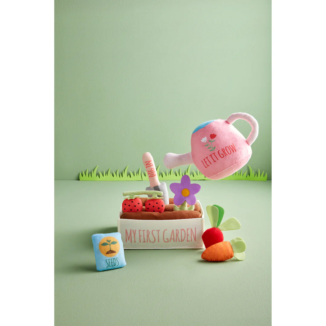 9-piece set. Felt garden plot comes with plush flower, carrot, two strawberries, radish, watering can with trickling water sound chip, seed packet and trowel. Ages 18M+.