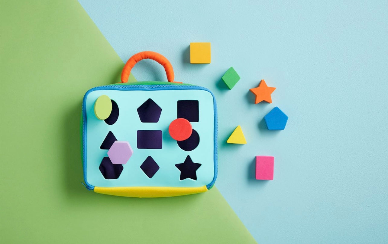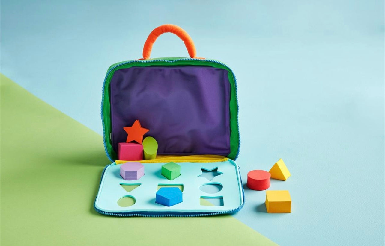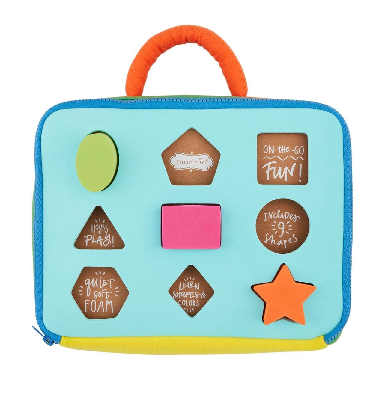 10-piece set. Plush take-along shape sorter with zipper comes with soft foam shapes. Age 6M+.