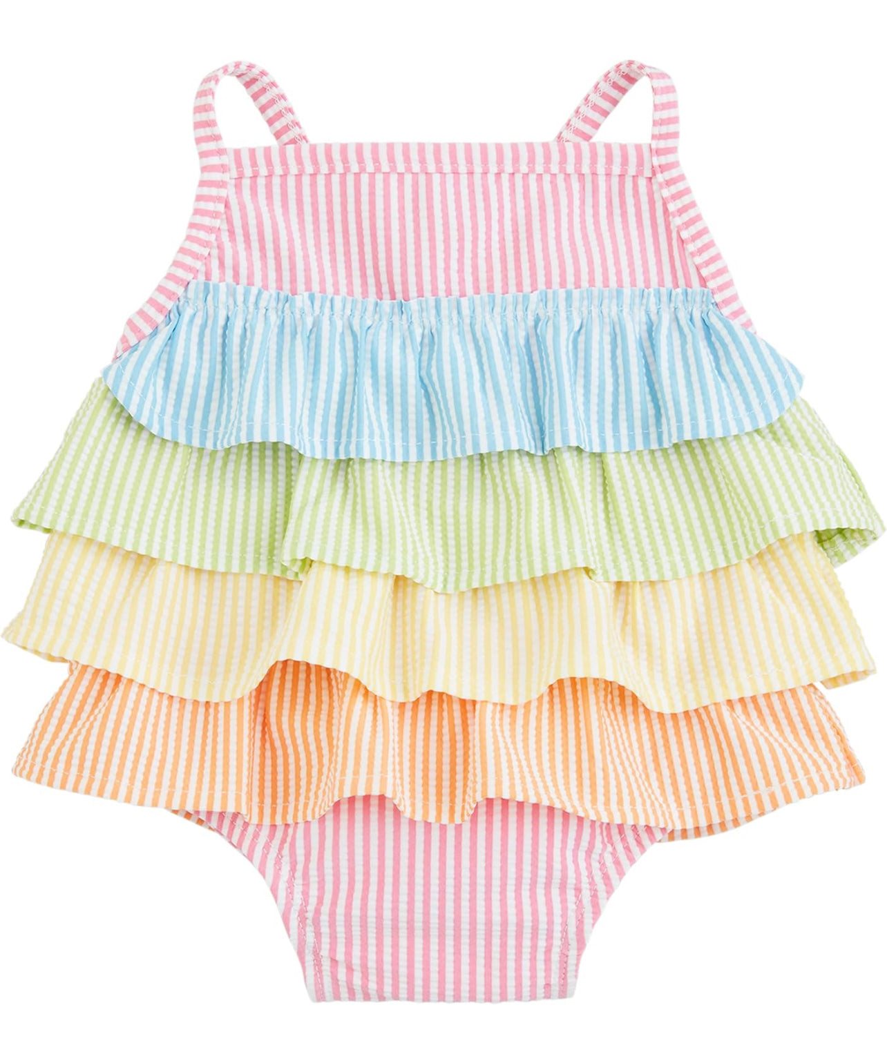 - The Girls' Seersucker Ruffle Swimsuit is a stylish and comfortable one-piece swimsuit