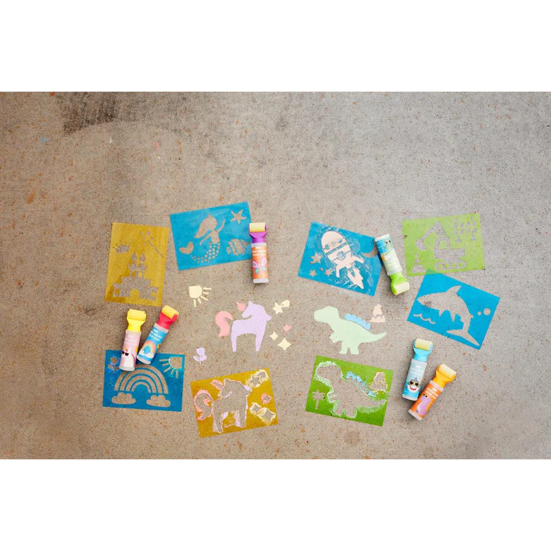 7-piece set. Three bottles of liquid roller chalk paint. Comes with four stencils.