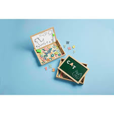 Foster creativity with the My Work Station set. The wooden storage box reverses from chalkboard to whiteboard. The set holds 42 magnetic letters, numbers and symbols. It also comes with a dry erase marker, chalk and eraser. We recommend using this toy for ages 3 and older.