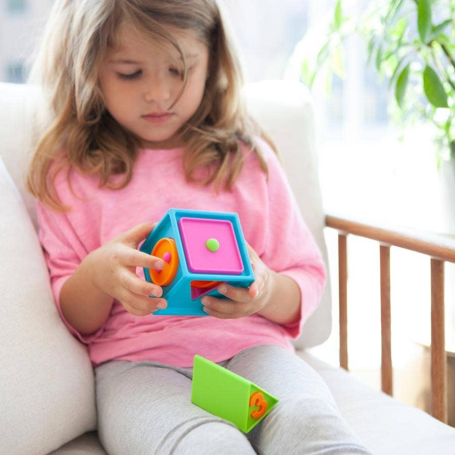 Count your way from early learner to kid-genius! Each block features a silicone number on one side and matching silicone dots on the other. Compare them, count them, and then see if you can flip and slide them together correctly to complete the cube. It's an ideal first brainteaser. For ages 2+.