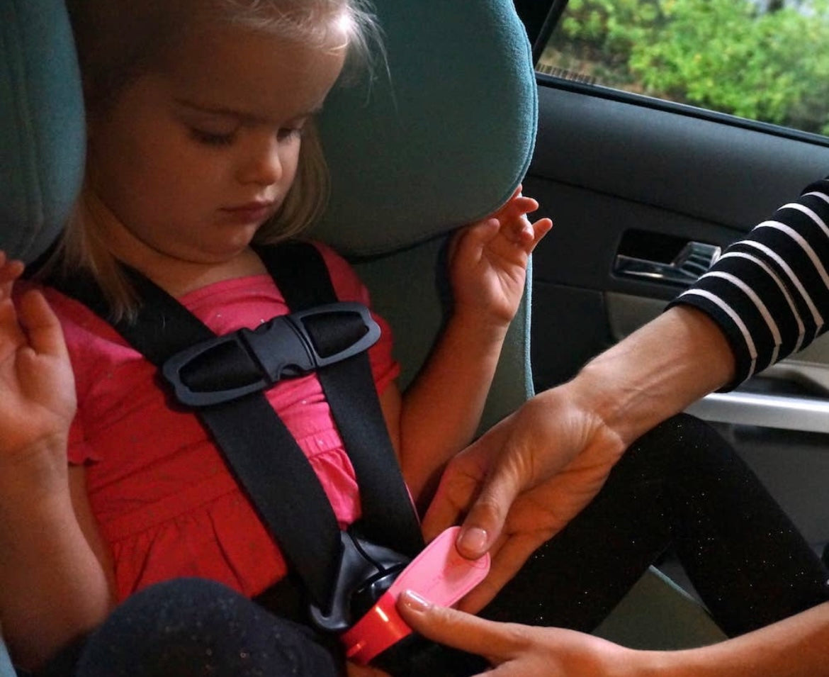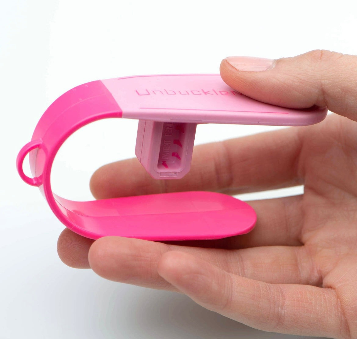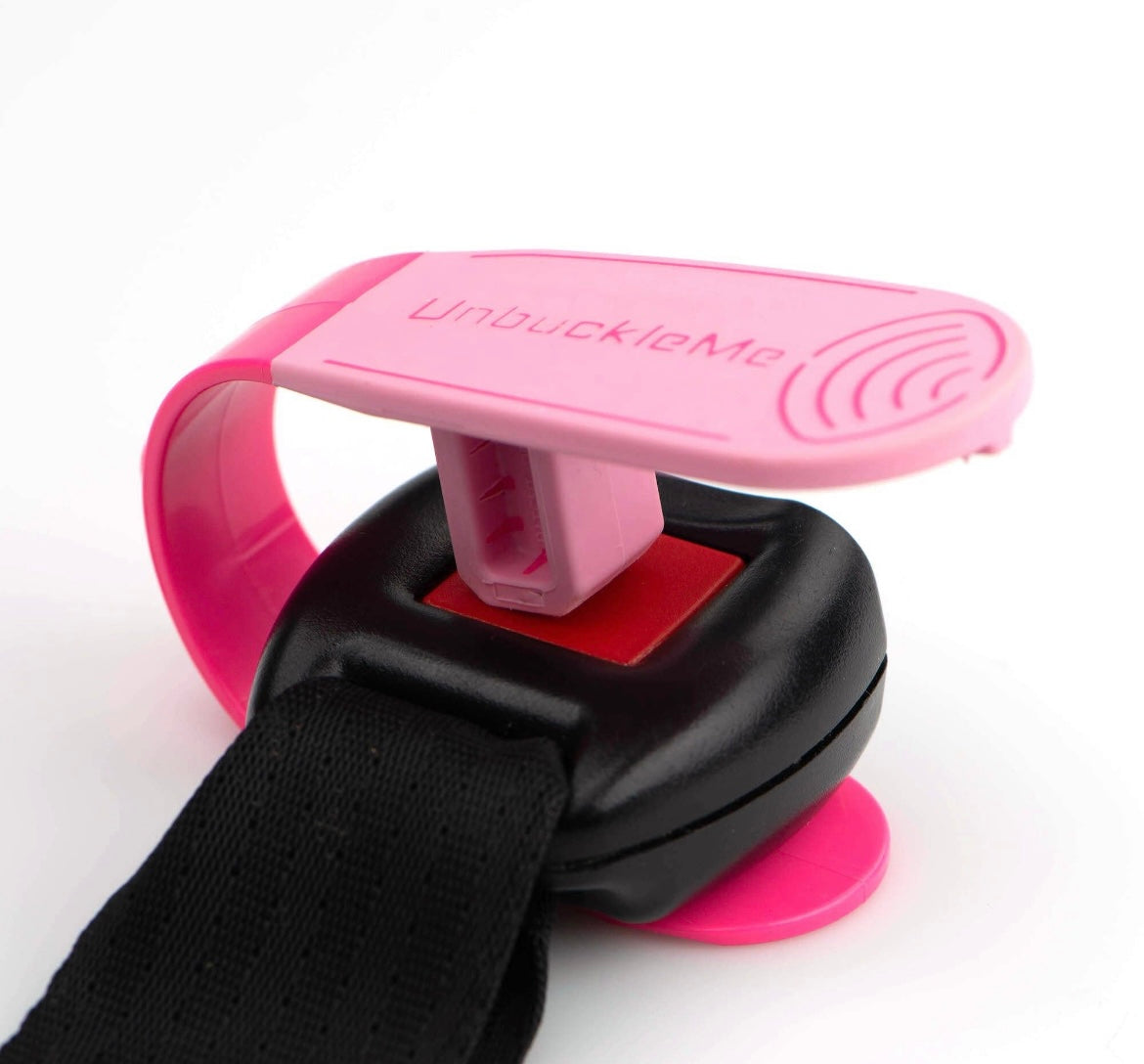 UnbuckleMe is a small tool that makes it 50% easier to unbuckle a child’s car seat. It prevents thumb pain and broken nails for parents and grandparents who struggle to push the red button. It does not attach to the car seat, for safety. Works on all push-button car seat buckles.